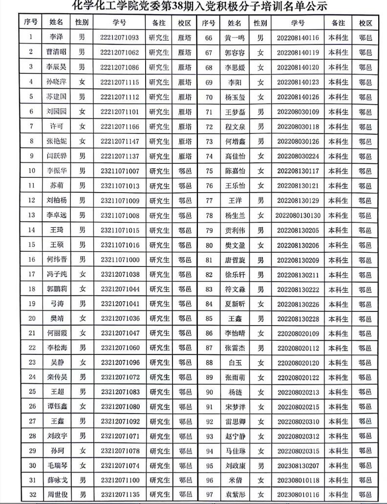 按照组织发展程序和党员发展工作安排,经各班、团及学团组织推荐,支部初审,各年级辅导员审核。2024年5月15日,经英国365党委会预审通过了英国365党委第38期入党积极分子培训班参训学员名单,现予以公示,如有异议,可向各年级辅导员反映,请广大师生监督。公示期:3天,监督电话:029-81469205