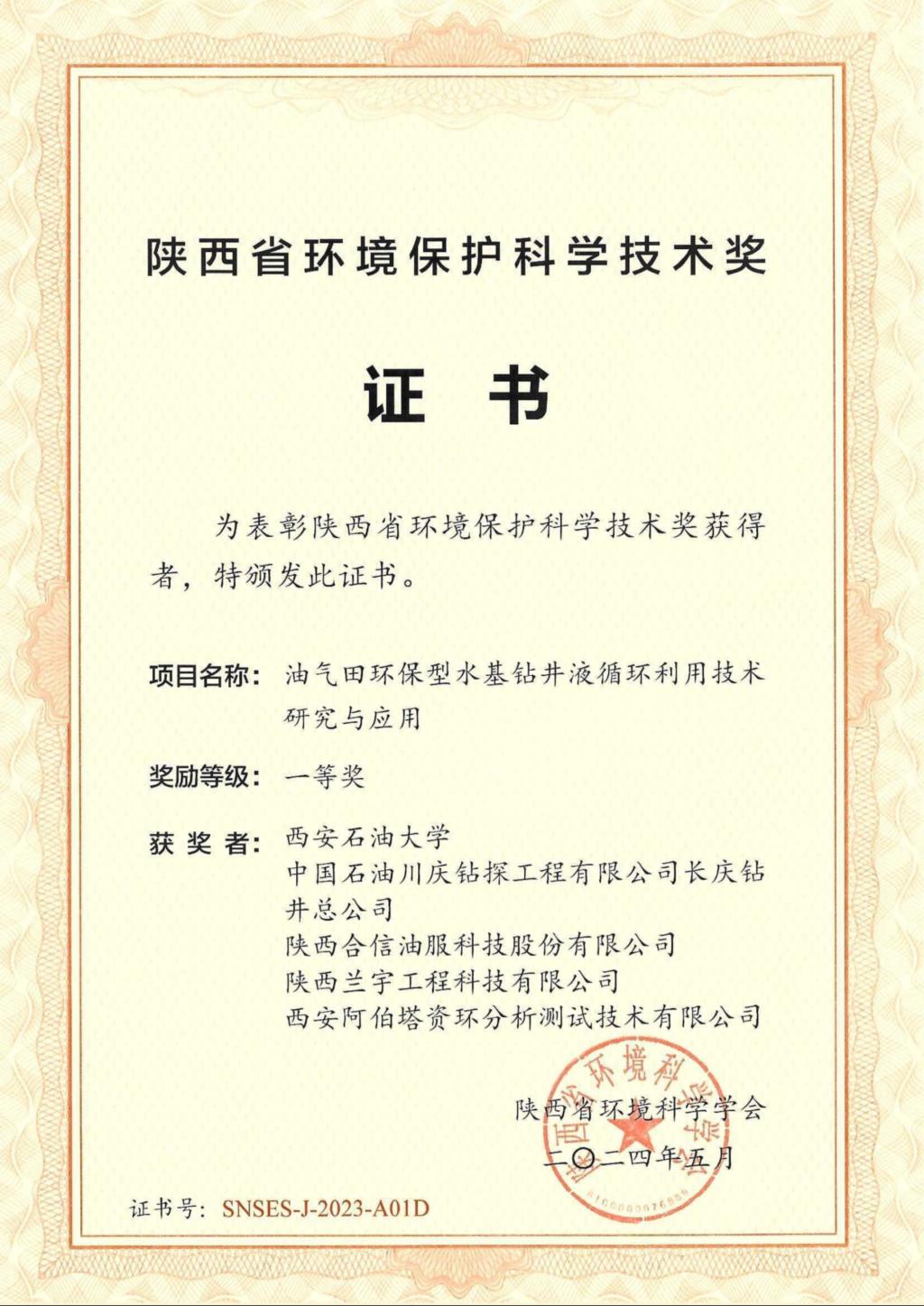 近日,我院陈刚教授团队与中国石油川庆钻探工程有限公司长庆钻井总公司、陕西合信油服科技股份有限公司、陕西兰宇工程科技有限公司和西安阿伯塔资环分析测试技术有限公司合作的科研成果获得2023年陕西省环境保护科学技术奖一等奖和2023年中国循环经济协会科学技术奖——科技进步奖(技术开发类)三等奖。